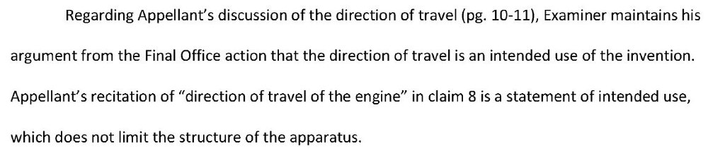 Claim 8 thus required a certain direction for drawing air into the core of the engine relative to the direction of travel. The applicant showed in the appeal brief how the cited art was essentially drawing air in the opposite direction relative to the direction of travel.